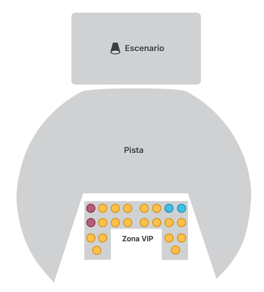Mesas numeradas con asientos asignados, ubicación preferencial frente al escenario (junto al house), servicio de mesero, botellas, mixers y atención dedicada. Algunas mesas también incluyen acceso a experiencias con artistas como meet & greets.
